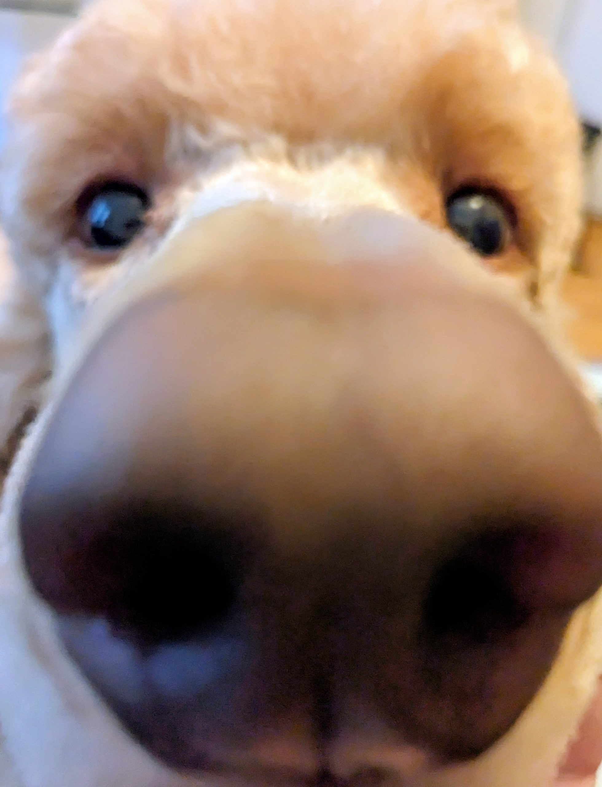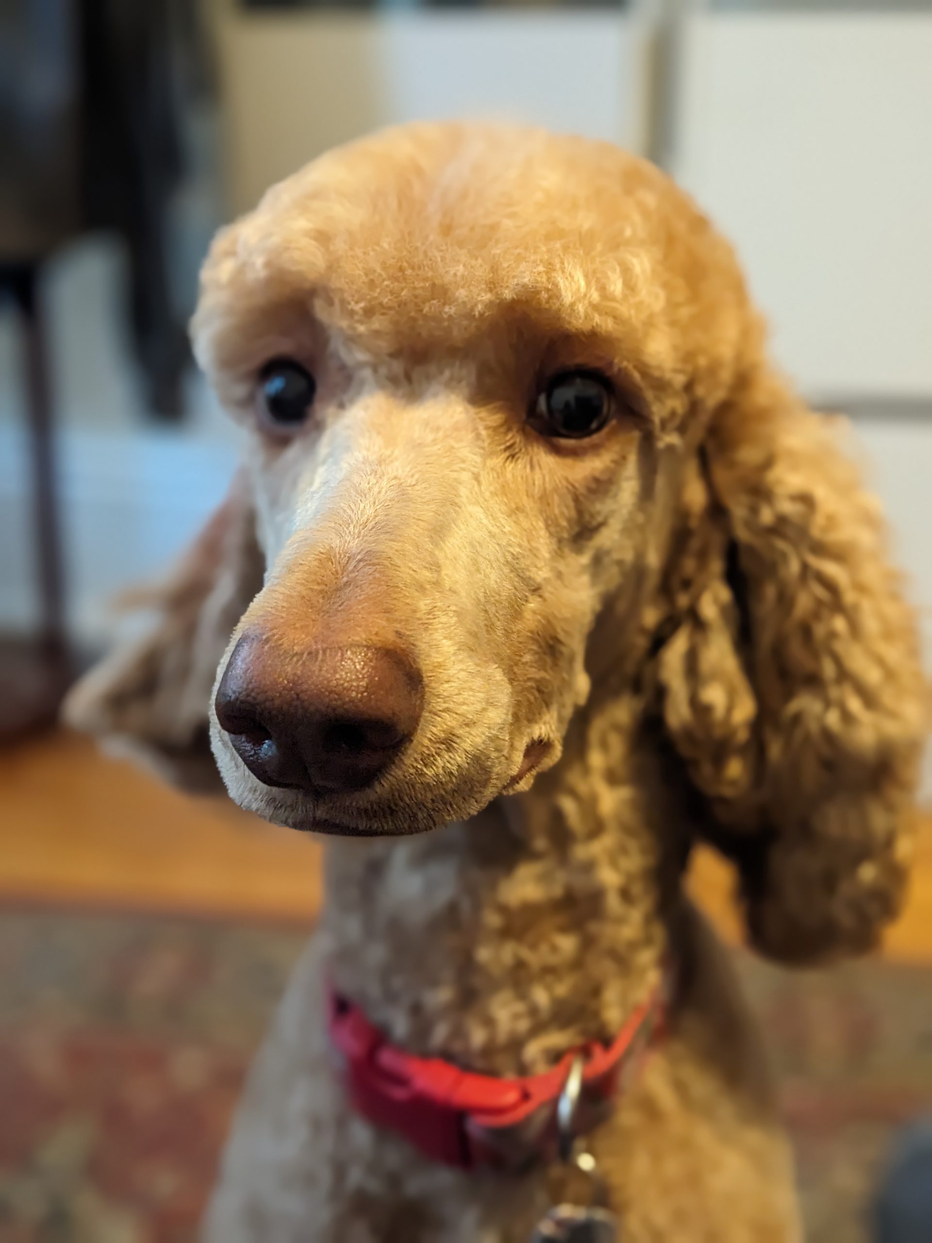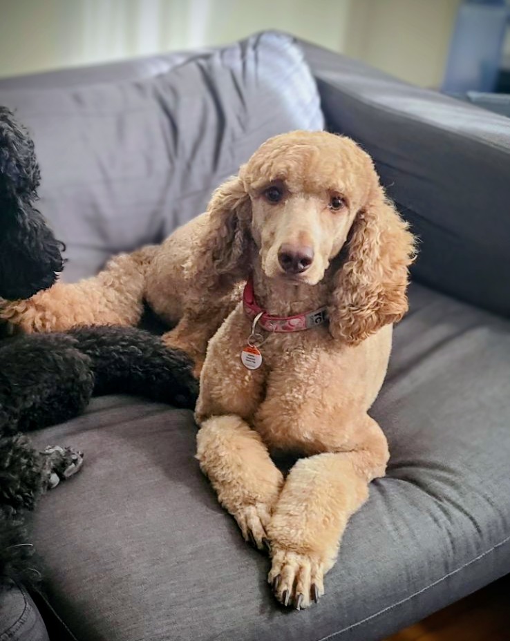 Chili first came into SPIN in May, 2023. She was one of two beautiful, red standard poodle eight month old puppies from a doodle breeding farm in Northern Ontario. A very looooong ground transport chain was arranged to bring them out of the breeding farm and into SPIN’s loving arms. The girls were named Ginger and Chili. Ten days later, the parents of Ginger and Chili were released and flown down with Pilots 4 Paws. We called them Tasha and Mav.