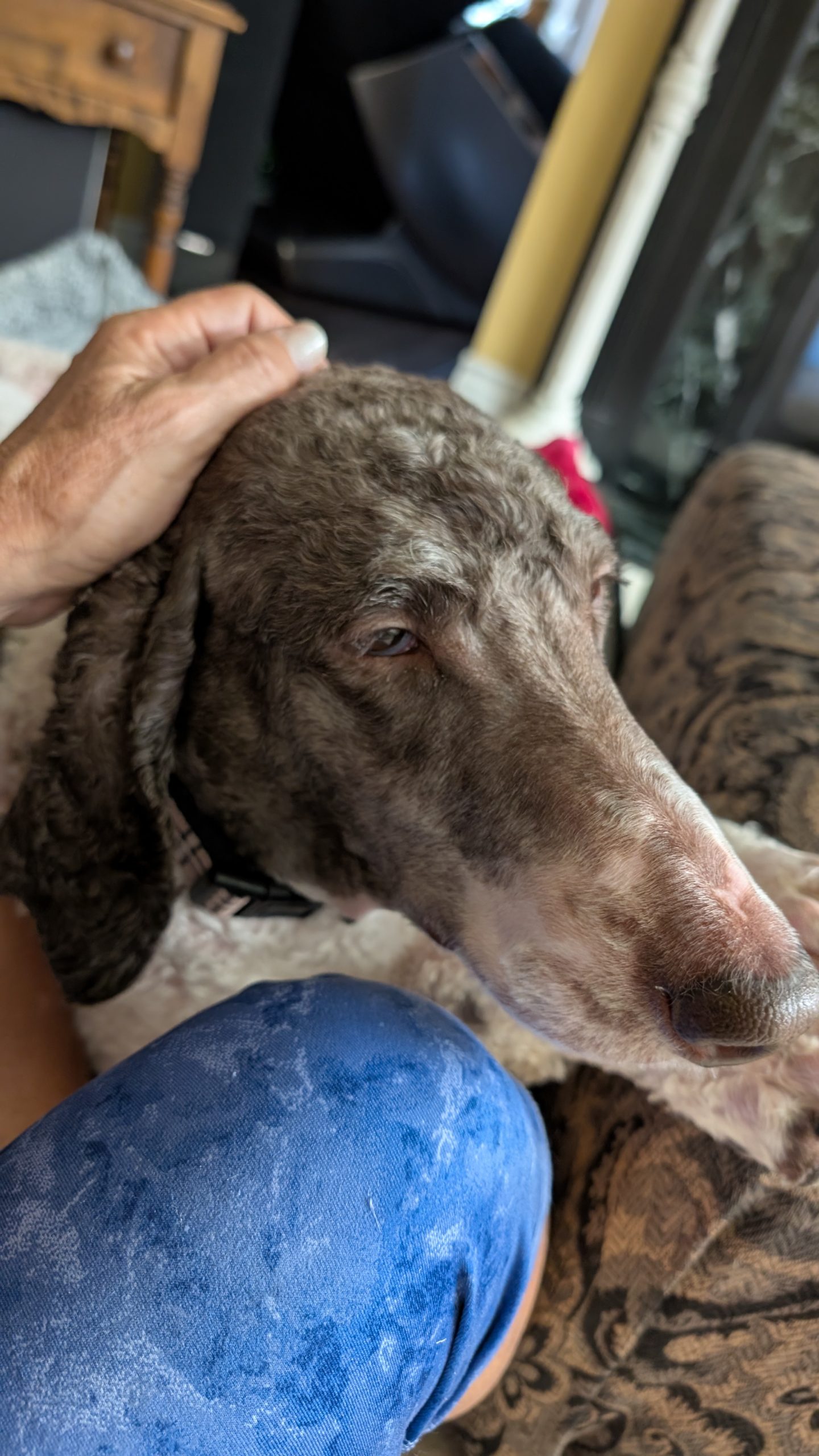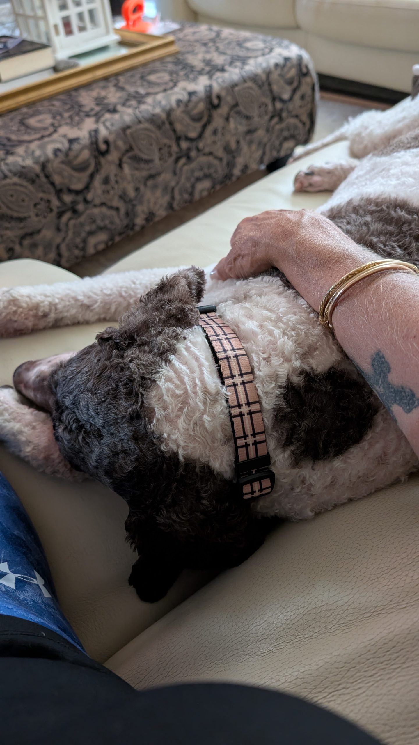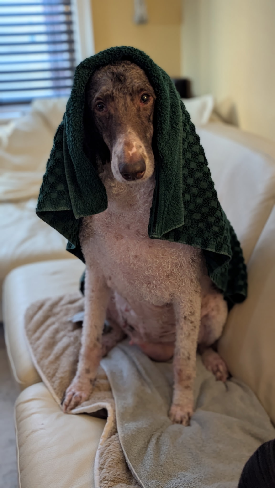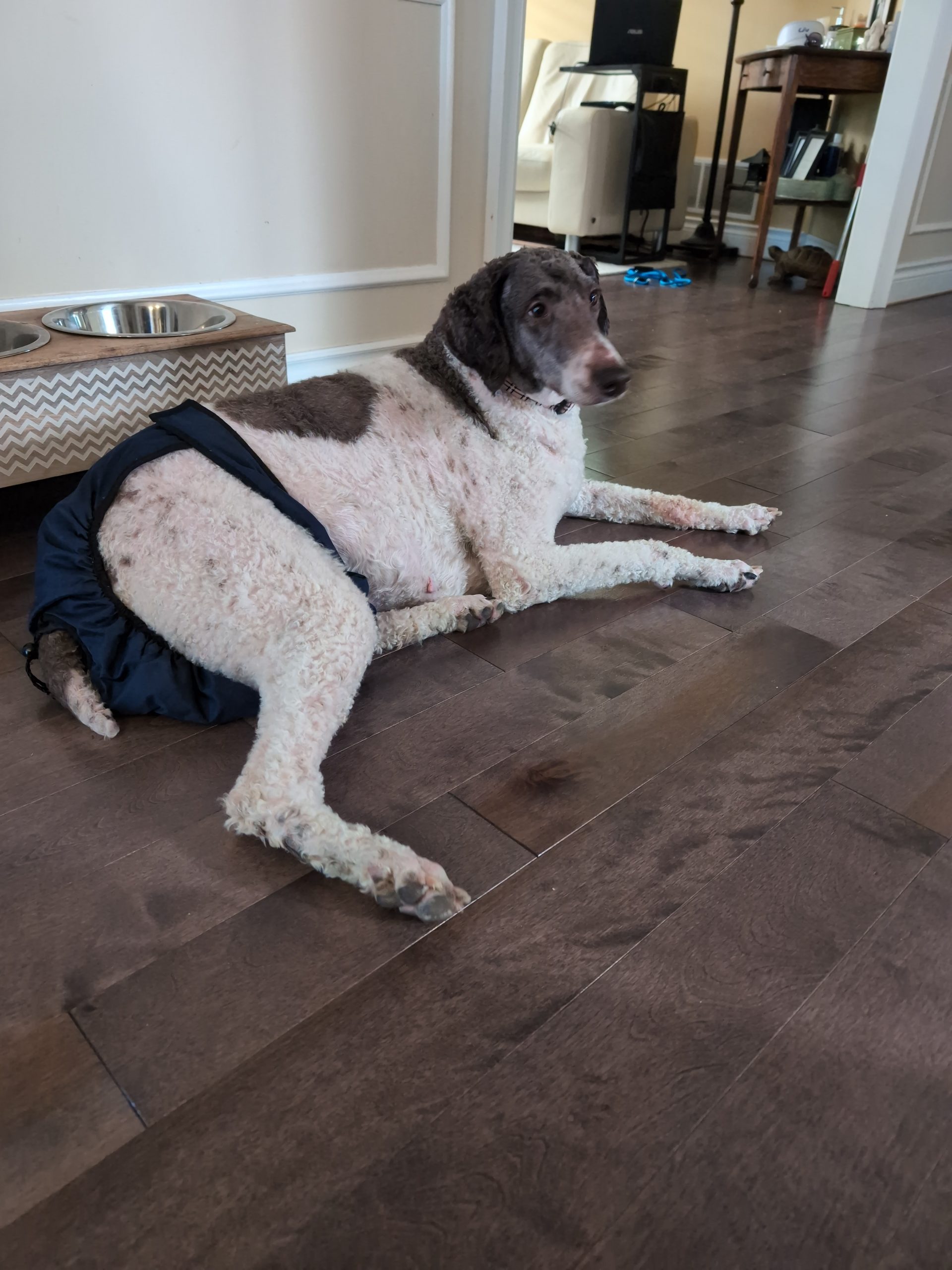 Well Miss Fidget, the world will now be a nicer place for you! Fidget arrives with SPIN after years of being a puppy mom, apparently no longer wanted as a breeder. We think she’s 5 or 6 and she’s obviously had many puppies. What we know: she’s the sweetest girl. Quiet, calm, gentle. An absolute dream to bath, dry and groom. She is carrying a lot of excess weight and has a HUGE mammary mass that will need surgery. Fidget is not available for adoption yet, but please join us in following her journey.
