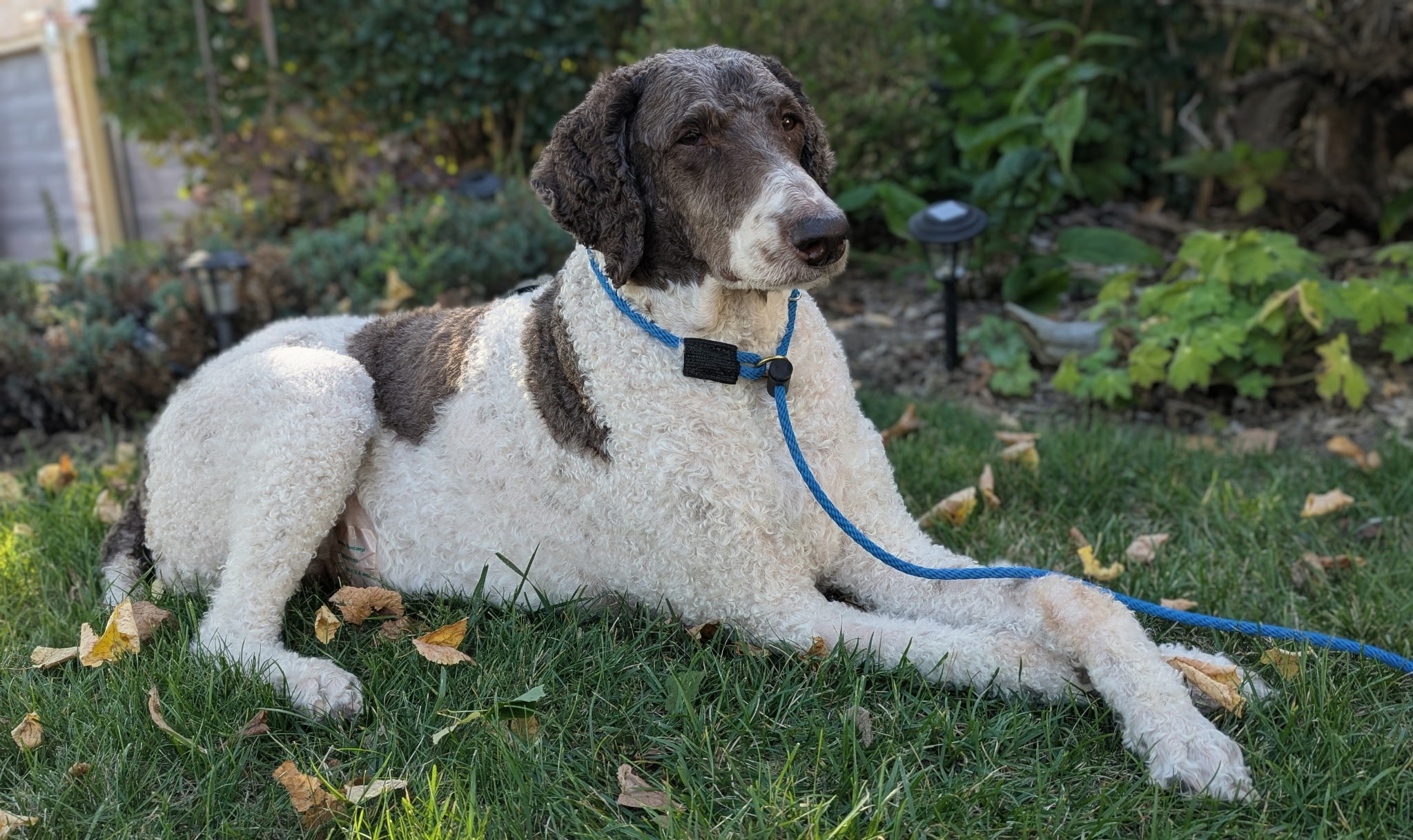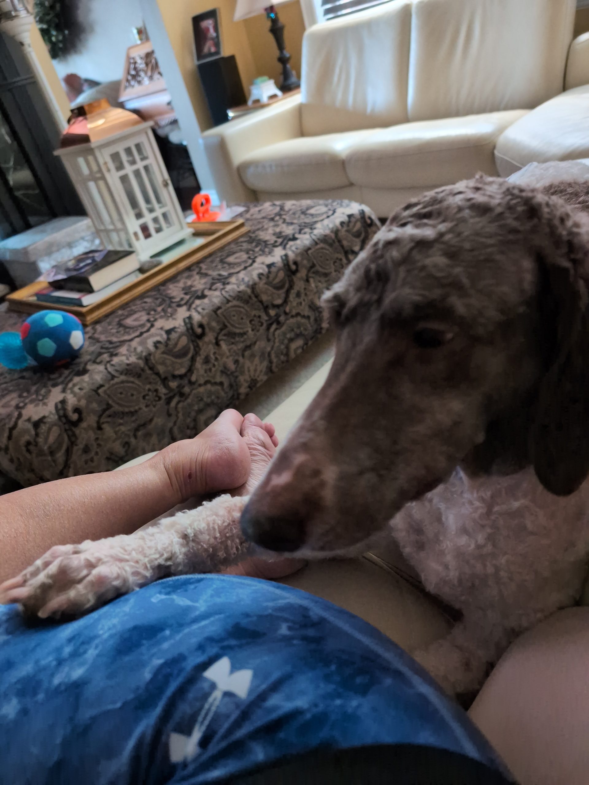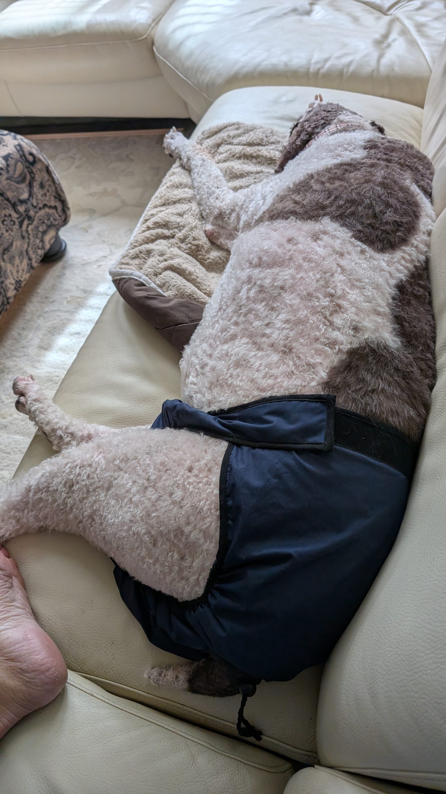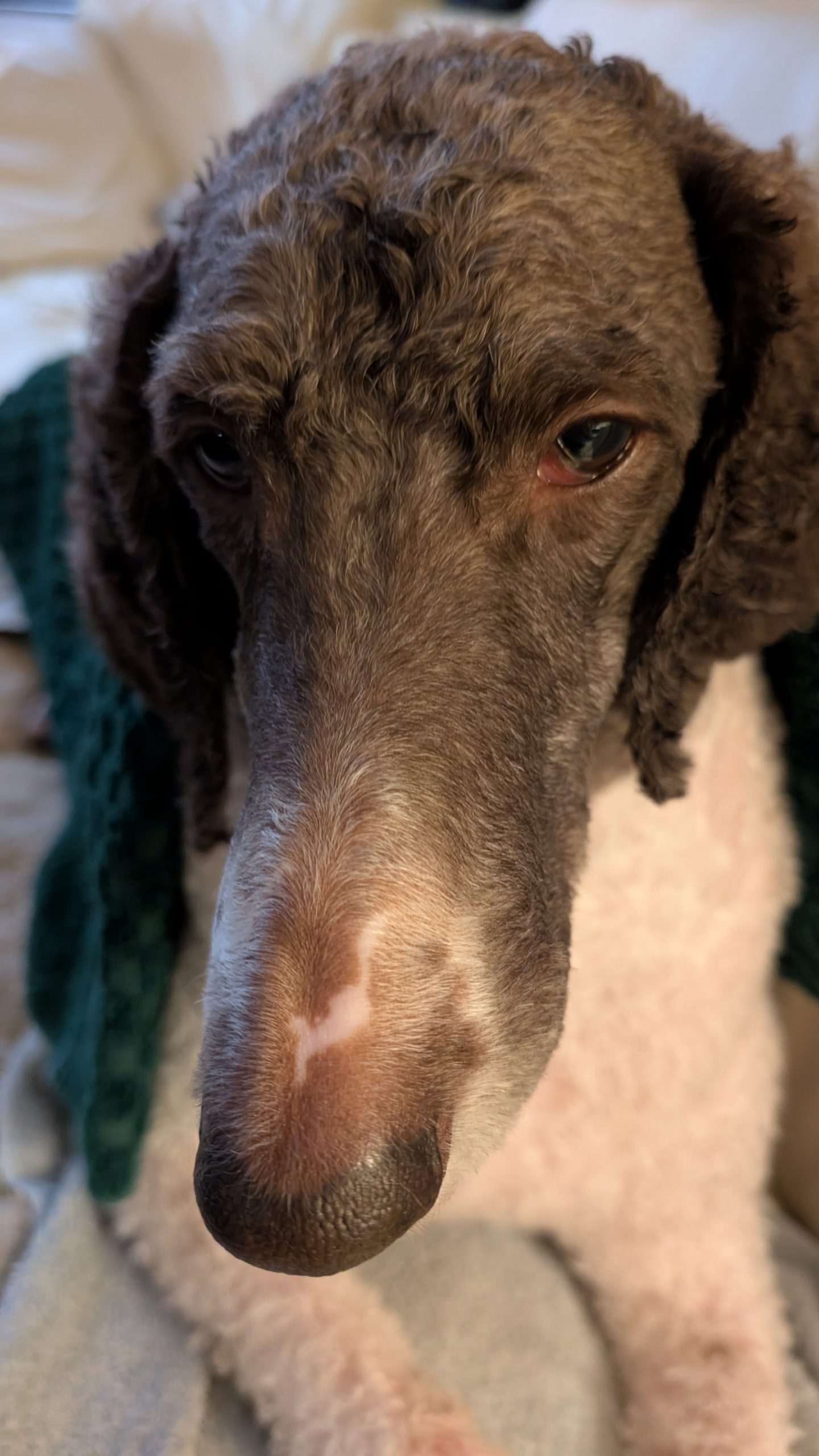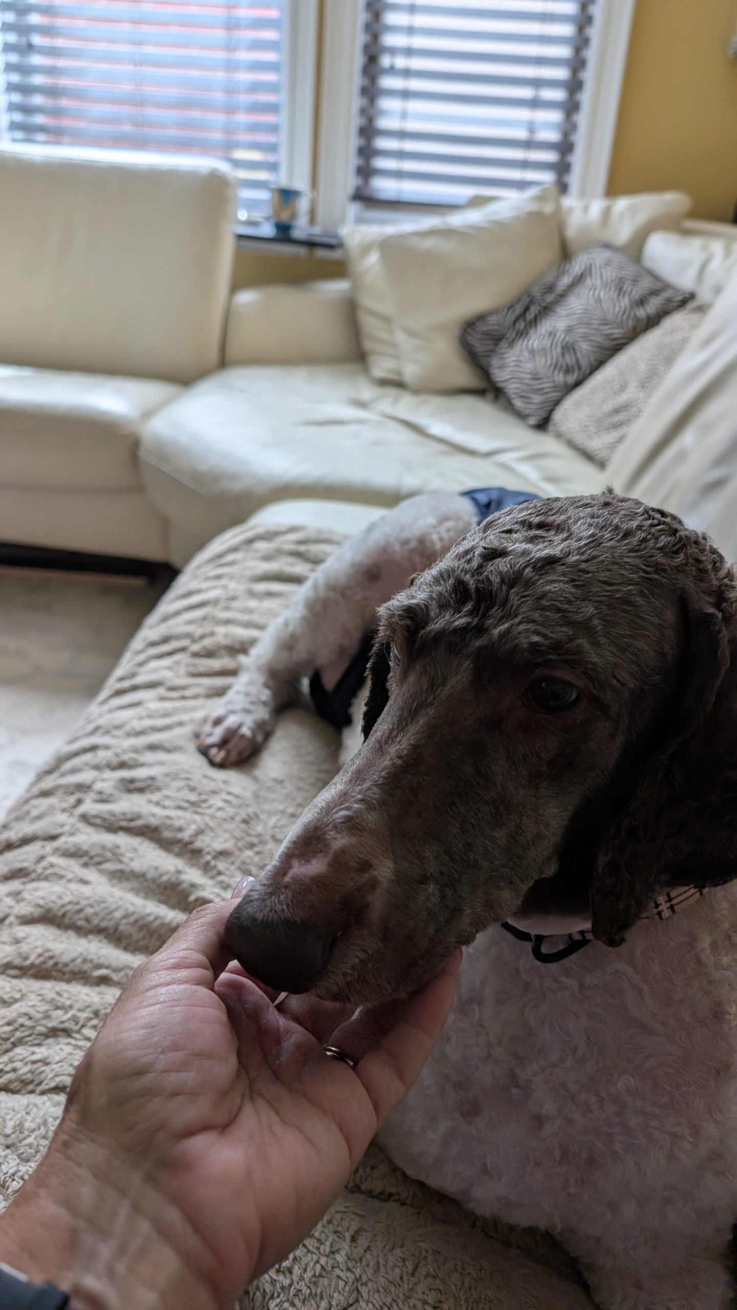 Well Miss Fidget, the world will now be a nicer place for you! Fidget arrives with SPIN after years of being a puppy mom, apparently no longer wanted as a breeder. We think she’s 5 or 6 and she’s obviously had many puppies. What we know: she’s the sweetest girl. Quiet, calm, gentle. An absolute dream to bath, dry and groom. She is carrying a lot of excess weight and has a HUGE mammary mass that will need surgery. Fidget is not available for adoption yet, but please join us in following her journey.
