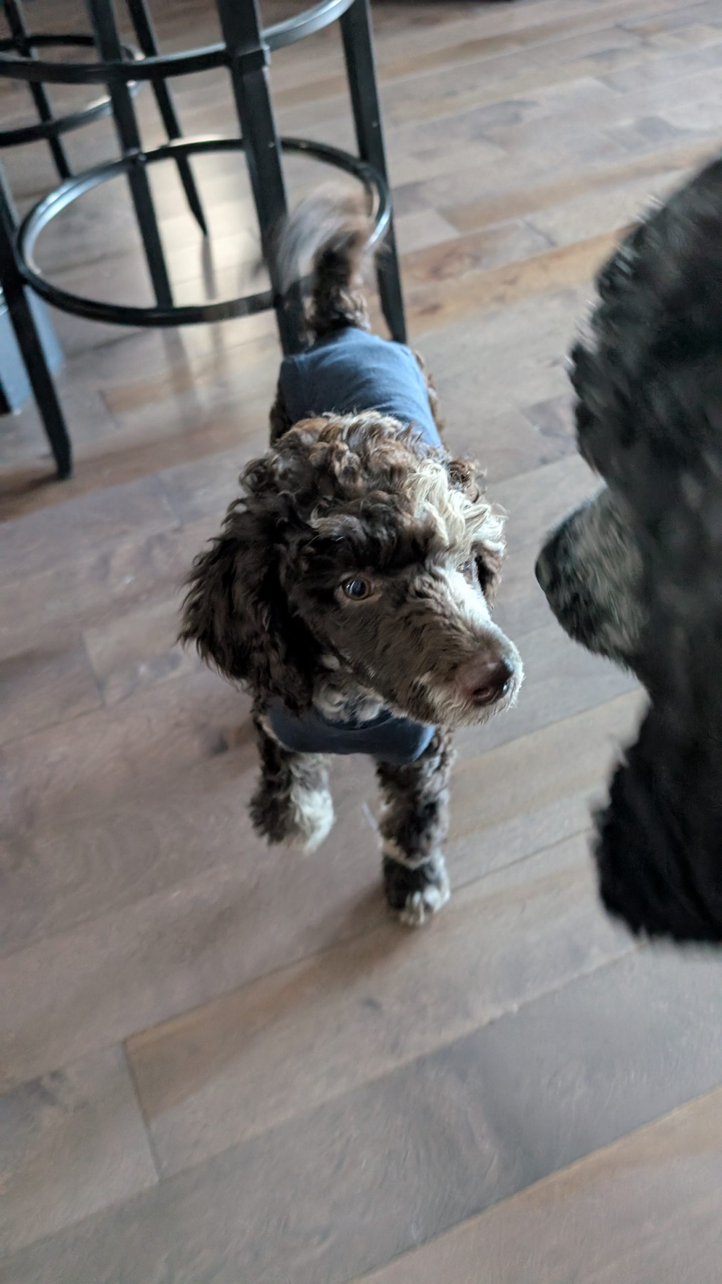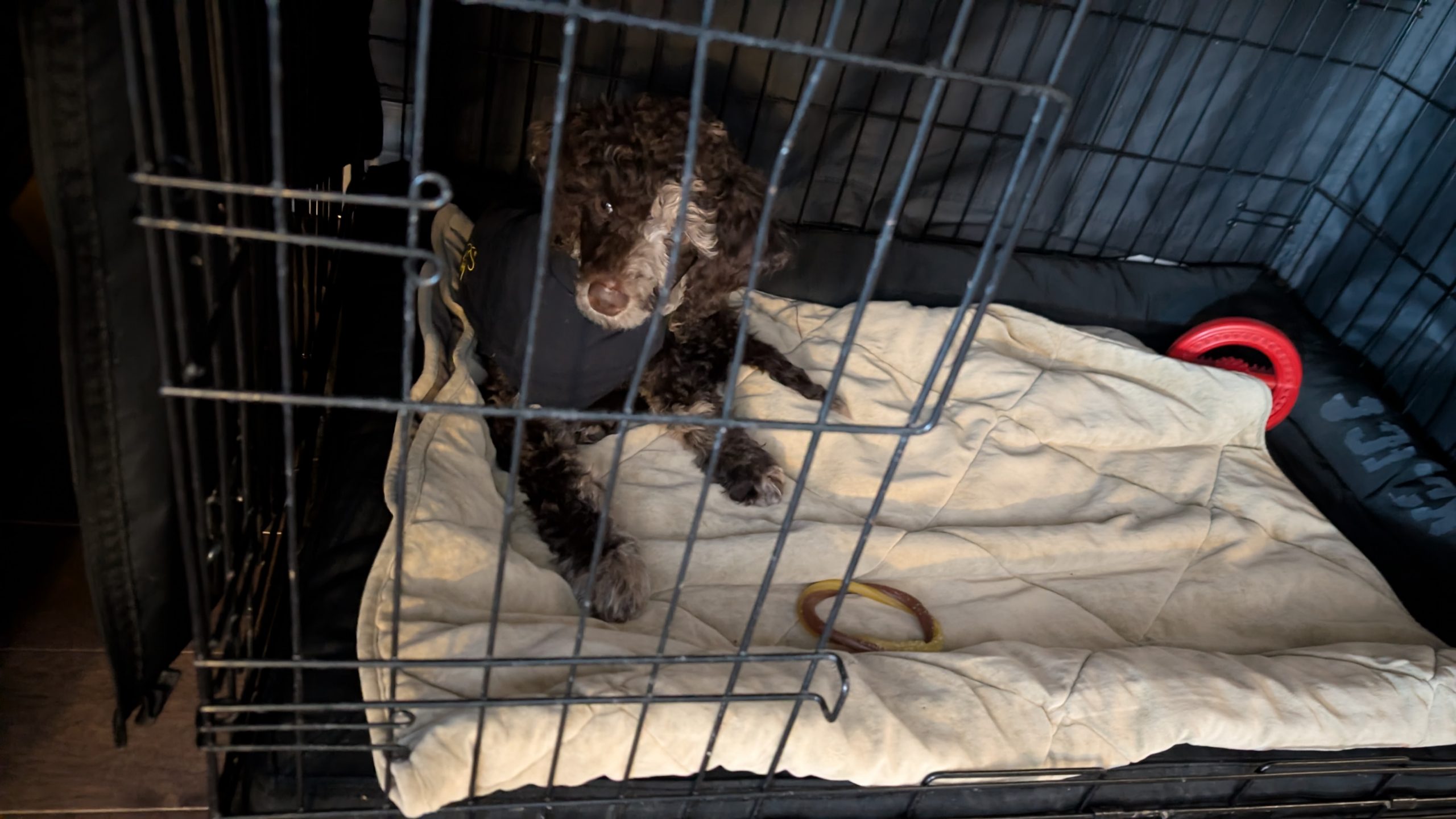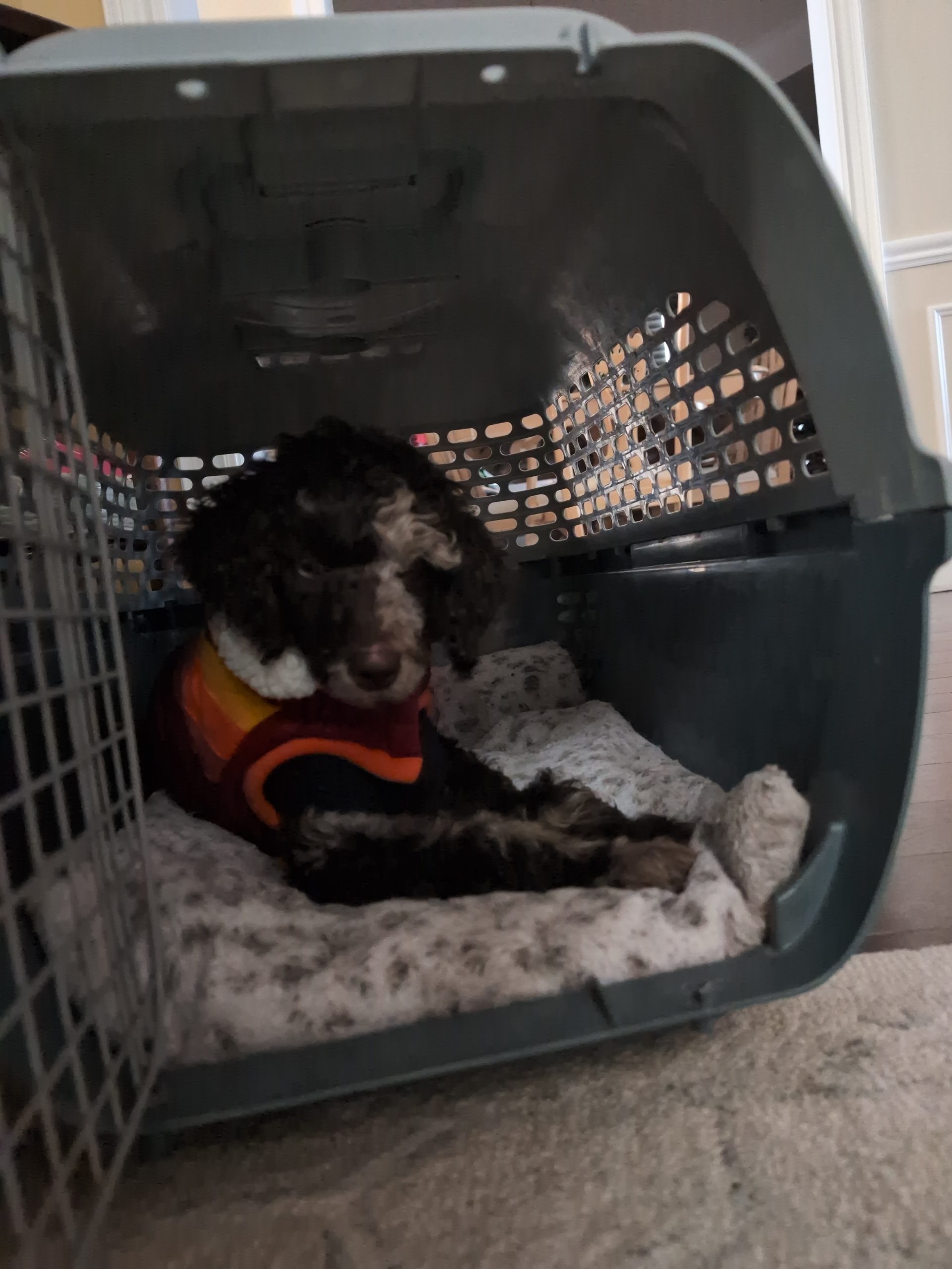 This medium-energy Standard Poodle mix is sweet, food-motivated, and eager to learn. He loves tug, chase, puzzle feeders, and being close to his people. He’s 95% house trained, doing well with crate training, and already showing how smart and adaptable he is.