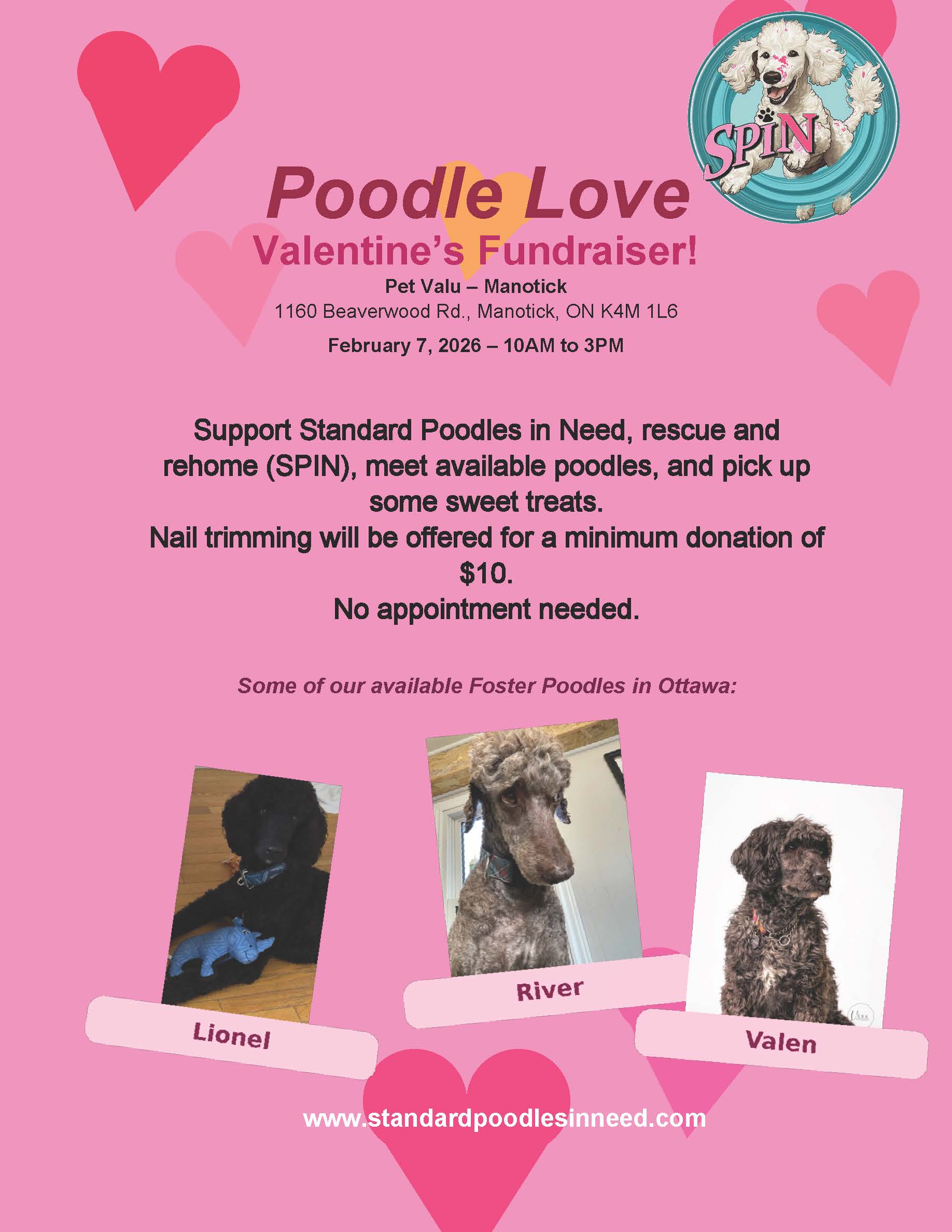 Support Standard Poodles in Need, rescue and rehome (SPIN), meet available poodles, and pick up some sweet treats. Nail trimming will be offered for a minimum donation of $10. No appointment needed.